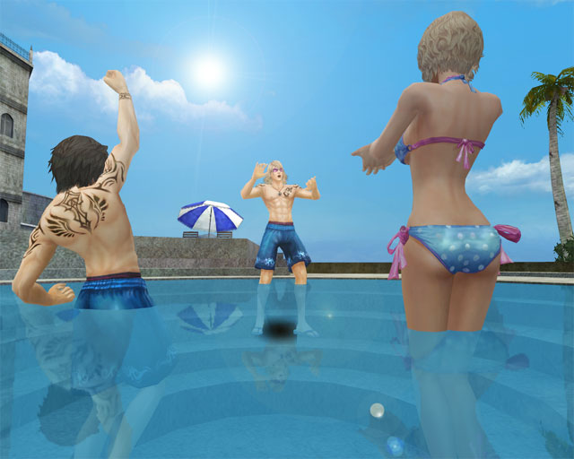 ウォータースプレーを使って、水の掛け合いしてるシーンを撮りたかったんですが、遊泳場ってアイテム使用できないんですね……。